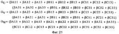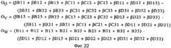Аналогичное вычисление видимой непрозрачности β для всех вокселов в секции два повторяют для каждой из других девяти колонок из трех вокселов в секции два, иллюстрируемой на фиг.19 (например, колонке вокселов В32, С32 и D32; В22, С22 и D22 и так далее). Таким образом вычисляют видимую непрозрачность β всех вокселов в секции два. Вычисленное значение видимой непрозрачности β для всех вокселов в секции два используют только в уравнениях, приведенных на фиг.22 для вычисления градиента видимой непрозрачности β воксела С22 в центре секции два.A similar calculation of the apparent opacity β for all voxels in section two is repeated for each of the other nine columns of three voxels in section two, illustrated in FIG. 19 (for example, voxel column B32, C32 and D32; B22, C22 and D22 and so on) . Thus, the apparent opacity β of all the voxels in section two is calculated. The calculated value of apparent opacity β for all voxels in section two is used only in the equations shown in Fig. 22 to calculate the gradient of visible opacity β of voxel C22 in the center of section two.