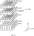 Объем волюметрических данных сначала разделяют на слои, как иллюстрируется на фиг.3, 4 и 5, причем каждый слой содержит ряды и столбцы вокселов, не показанных на этих чертежах, но показанных на фиг.15-17. Объемная визуализация данных может быть ускорена путем уменьшения числа вокселов, которые подвергают обработке, загрузке и визуализации путем исключения прозрачных вокселов. Такая объемная визуализация является сущностью ранее упомянутого патента США №6304266, который включен в эту заявку в качестве ссылки.The volume of volumetric data is first divided into layers, as illustrated in FIGS. 3, 4 and 5, with each layer containing rows and columns of voxels not shown in these drawings, but shown in FIGS. 15-17. Volumetric data visualization can be accelerated by reducing the number of voxels that are processed, loaded and visualized by eliminating transparent voxels. Such volumetric visualization is the essence of the previously mentioned US patent No. 6304266, which is incorporated into this application by reference.