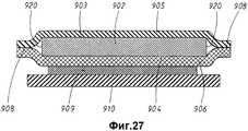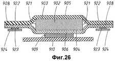 На фиг.25-27 показана гигиеническая прокладка 901 с почти такой же структурой, как у ранее описанной гигиенической прокладки 801 по фиг.22-24. Следовательно, нумерация различных элементов гигиенической прокладки 901 на фиг.25-27 выполнена по аналогии с нумерацией, используемой при описании гигиенической прокладки 801 по фиг.22-24. Данный вариант осуществления отличается тем, что первый и второй отдельные листы 905, 906 являются прозрачными, по меньшей мере, в тех зонах, которые находятся снаружи по отношению к продольным и поперечным краям 921, 920 абсорбирующей сердцевины 902. В данном случае первый и второй отдельные листы 905, 906 простираются настолько далеко наружу по отношению к продольным краям 921 абсорбирующей сердцевины 902, что гигиеническая прокладка 901 будет иметь два прозрачных боковых крылышка 922. Боковые крылышки 922 расположены с обеих боковых сторон абсорбирующей сердцевины 902. Боковые крылышки 922 выполнены с такой формой и размерами, что их можно загнуть вокруг краев, предназначенных для ног отверстий трусов во время использования.25-27, a