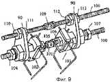На стержне 100 каждый из опорных элементов 102 и 103 установлен с возможностью перемещения посредством пар регулировочных гаек, соответственно, 104, 105, и 106, 107. Серьга 90 каждого опорного элемента расположена с возможностью продольного и углового перемещения на дополнительном стержне 108. Последний в центральной части имеет шарнир 109. Серьга 90 опорного элемента 102 установлена в дополнительном стержне 108 посредством дополнительной пары регулировочных гаек 110, 111, а серьга 90 опорного элемента 103 установлена на дополнительном стержне 108 посредством дополнительной пары регулировочных гаек 112, 113.On the