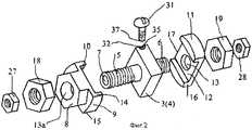 Каждый из стопорного элемента 31 и 33 может быть выполнен в виде винта (фиг.1-5). Торцевая поверхность 37 каждого стопорного элемента (фиг.3) и 38 (фиг.5) выполнена перпендикулярно его продольной оси.Each of the locking