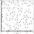 На фиг.1 показано распределение зерна в известном ранее инструменте, соответствующее случайно генерированным x, y координатным значениям, где можно видеть нерегулярное распределение вдоль x и y осей.Figure 1 shows the grain distribution in a previously known tool, corresponding to randomly generated x, y coordinate values, where you can see an irregular distribution along the x and y axes.