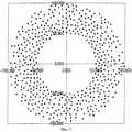 На фиг.3 показана матрица абразивного зерна в соответствии с настоящим изобретением, причем матрица имеет случайные x, y координатные значения, которые ограничены таким образом, что каждая пара случайно генерированных координатных значений отличается от ближайшей пары координатных значений на заданную минимальную величину (k), чтобы создать исключающую зону вокруг каждой точки в матрице.Figure 3 shows the matrix of abrasive grain in accordance with the present invention, and the matrix has random x, y coordinate values, which are limited in such a way that each pair of randomly generated coordinate values differs from the nearest pair of coordinate values by a given minimum value (k), to create an exclusion zone around each point in the matrix.