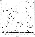 На фиг.4 показана матрица абразивного зерна в соответствии с настоящим изобретением, причем матрица ограничена вдоль x и y осей числовыми последовательностями, в которых каждое координатное значение на оси отличается от следующего координатного значения на постоянную величину. Матрица дополнительно ограничена за счет разделения пар координатных значений и случайного нового соединения пар таким образом, что каждая вновь случайно соединенная пара координатных значений отделена от ближайшей пары координатных значений на заданную минимальную величину.Figure 4 shows the matrix of abrasive grain in accordance with the present invention, and the matrix is limited along the x and y axes by numerical sequences in which each coordinate value on the axis differs from the next coordinate value by a constant value. The matrix is additionally limited due to the separation of pairs of coordinate values and a random new connection of pairs in such a way that each newly randomly connected pair of coordinate values is separated from the nearest pair of coordinate values by a predetermined minimum value.