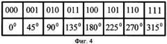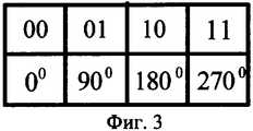 Правило формирования координатно-фазового портрета заключается в следующем. В процессе просмотра (сканирования) массива пикселей (матрицы) изображения анализируемого графического объекта в направлении сверху-вниз и слева-направо (построчно) осуществляется пошаговая оценка перехода бит (дибит, трибит и т.д.) в состояние, соответствующее конкретной фазе, в зависимости от выбранной схемы правил, показанных на Фиг.3 и Фиг.4. Результат формирования координатно-фазового портрета (фрагмент) показан на Фиг.5.The rule for the formation of the coordinate phase portrait is as follows. In the process of viewing (scanning) an array of pixels (matrix) of the image of the analyzed graphic object in the direction from top to bottom and from left to right (line by line), a step-by-step assessment of the transition of bits (dibit, tribit, etc.) to the state corresponding to a specific phase is performed, in depending on the selected scheme of the rules shown in Fig.3 and Fig.4. The result of the formation of the coordinate-phase portrait (fragment) is shown in Fig.5.