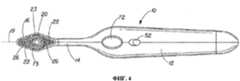 Translated fromRussian1. Электрическая зубная щетка с подсветкой, содержащая1. Backlit electric toothbrush containing(a) ручку, головку и суженную часть, расположенную между ручкой и головкой, вдоль продольной оси, причем ручка имеет внутреннюю полость, головка имеет расположенные на ней щетинки;(a) a handle, a head and a tapered portion located between the handle and the head along a longitudinal axis, the handle having an internal cavity, the head having bristles located on it;(b) по меньшей мере один светодиод, расположенный на головке, при этом светодиод испускает свет, плотность потока излучения которого больше 30 мВт/см2 на расстоянии до детектора 0,68 см при площади апертуры детектора 0,46 см2, и при этом температура, создаваемая излучением светодиода на поверхности зубов, удаленных от светодиода на расстояние 0,68 см, не превышает 43°С после 2 мин облучения;(b) at least one LED located on the head, the LED emits light whose radiation flux density is greater than 30 mW / cm2 at a distance of 0.68 cm from the detector with a detector aperture of 0.46 cm2 , and the temperature created by the radiation of the LED on the surface of the teeth remote from the LED at a distance of 0.68 cm does not exceed 43 ° C after 2 min of irradiation;(c) один или более подвижных держателей щетины, расположенных на головке, причем они имеют множество расположенных на них щетинок; и(c) one or more movable bristle holders located on the head, and they have many located on them bristles; and(d) двигатель, расположенный во внутренней полости ручки и функционально соединенный с подвижными держателями щетины посредством приводного вала.(d) an engine located in the inner cavity of the handle and operatively connected to the movable bristle holders by means of a drive shaft.2. Электрическая зубная щетка с подсветкой по п.1, в которой упомянутая плотность потока составляет от 30 до 300 мВт/см2.2. An illuminated electric toothbrush according to claim 1, wherein said flux density is from 30 to 300 mW / cm2 .3. Электрическая зубная щетка с подсветкой по п.1, в которой упомянутый электрический ток является непрерывным прямым током величиной более 35 мА.3. The backlit electric toothbrush according to claim 1, wherein said electric current is a continuous forward current of more than 35 mA.4. Электрическая зубная щетка с подсветкой по п.1, в которой упомянутый электрический ток является импульсным прямым током, пиковое значение которого превышает 100 мА.4. The backlit electric toothbrush according to claim 1, wherein said electric current is a pulsed direct current whose peak value exceeds 100 mA.5. Электрическая зубная щетка с подсветкой по п.1, в которой полная электрическая мощность указанного светодиода составляет менее 1 Ватта.5. The backlit electric toothbrush according to claim 1, wherein the total electrical power of said LED is less than 1 Watt.6. Электрическая зубная щетка с подсветкой по п.1, в которой упомянутый светодиод содержит по меньшей мере две полупроводниковые подложки, обладающие свойствами светоиспускания, и одну общую линзу.6. The backlit electric toothbrush according to claim 1, wherein said LED comprises at least two semiconductor substrates having light emitting properties and one common lens.7. Электрическая зубная щетка с подсветкой по п.6, в которой упомянутый светодиод излучает свет с длиной волны от 440 до 480 нм.7. An illuminated electric toothbrush according to claim 6, wherein said LED emits light with a wavelength of 440 to 480 nm.8. Электрическая зубная щетка с подсветкой по п.6, в которой упомянутый светодиод содержит далее два вывода.8. An illuminated electric toothbrush according to claim 6, wherein said LED further comprises two leads.9. Электрическая зубная щетка с подсветкой по п.6, в которой упомянутый светодиод содержит далее три вывода.9. An illuminated electric toothbrush according to claim 6, wherein said LED further comprises three leads.10. Электрическая зубная щетка с подсветкой, содержащая10. Illuminated electric toothbrush containing(a) ручку, головку и суженную часть, расположенную между ручкой и головкой, вдоль продольной оси, причем ручка имеет внутреннюю полость, головка имеет расположенные на