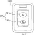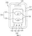 В качестве входа 120 используется электронная сенсорная кнопка, такая как сенсорная клавишная панель или механический кнопочный выключатель вида точки физического контакта. Вход 120 (фиг.2) содержит автоматический кнопочный выключатель 121 и ручной кнопочный выключатель 122. Автоматический кнопочный выключатель 121 и ручной кнопочный выключатель 122 изготовлены в виде обычной кнопки единственного нажатия клавиши. Выходом 130 звука является обычный динамик. Индикатор 140 содержит несколько светоизлучающих элементов, таких как лампы или LED (светодиоды), которые могут преобразовывать состояние "включено" и состояние "выключено". Один из светоизлучающих элементов светит красным цветом, а другой светит зеленым цветом.As