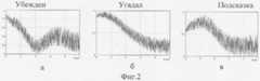 На фигуре 2 представлены экспериментально измеренные автокорреляционные функции траектории движения курсора манипулятора при различных условиях выдачи ответов - при убежденности в правильности действий (фиг.2а), при подсказанном ответе (фиг.2в) и при угаданном ответе (фиг.2б). Разброс значений величины автокорреляционной функции, обусловленный разбросом в психодинамических параметрах испытуемых, погрешностью измерений и другими аналогичными факторами, представлен в виде шума, амплитуда которого образует некоторый интервал, в пределах которого проведение оценок вполне справедливо. В первом случае (фиг.2а), когда ответ правильный и отвечающий подсознательно убежден в правильности своих действий, автокорреляционная функция траектории движения курсора манипулятора имеет ярко выраженный максимум в начале координат. Во втором случае (фиг.2б) сдвиг максимума автокорреляционной функции обусловлен порождаемым на подсознательном уровне противоречием между необходимостью «правильных действий» и невозможностью их проведения в текущей ситуации. Это порождает заметное отклонение положения текущей «рабочей точки», отражающей текущее состояние личности на поверхности скорости пондемоторной реакции (фиг.1а и б), что в терминах парно конкурирующих психодинамических характеристик отражается как рассогласование или нарушение в мотивации поведения. В третьем случае (фиг.2в) этот процесс имеет экстремальное выражение в смысле противоречия между парно конкурирующими показателями и их выражением в поведенческой мотивации, т.е. ответ был подсказан.The figure 2 presents the experimentally measured autocorrelation functions of the trajectory of the cursor of the manipulator under various conditions for issuing answers - with confidence in the correctness of the action (figa), with the prompted answer (figv) and with the guessed answer (fig.2b). The scatter of the values of the autocorrelation function, due to the scatter in the psychodynamic parameters of the subjects, the measurement error and other similar factors, is presented in the form of noise, the amplitude of which forms a certain interval within which the assessment is quite fair. In the first case (figa), when the answer is correct and the respondent is subconsciously convinced of the correctness of their actions, the autocorrelation function of the trajectory of the cursor of the manipulator has a pronounced maximum at the origin. In the second case (fig.2b), the shift in the maximum of the autocorrelation function is due to the contradiction generated at the subconscious level between the need for "right actions" and the impossibility of carrying them out in the current situation. This gives rise to a noticeable deviation of the position of the current “working point”, reflecting the current state of the personality on the surface of the pondemotor reaction speed (figa and b), which in terms of paired competing psychodynamic characteristics is reflected as a mismatch or violation in the motivation of behavior. In the third case (Fig. 2c), this process has an extreme expression in the sense of a contradiction between paired competing indicators and their expression in behavioral motivation, i.e. The answer was prompted.