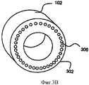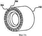 Обратимся теперь к Фиг.3А и 3В, на которых представлены альтернативные изометрические изображения кассеты 102, показанной на Фиг.1 и 2, которые даются со стороны 300 ввода шприца и со стороны 302 выхода иглы соответственно. Показана сторона 300 для ввода шприца кассеты 102, которая имеет множество отверстий 304, чтобы дать возможность каждой игле входить в соединение со шприцем 210 (Фиг.2А) в соответствующее время в процессе работы устройства. Показана сторона 302 выхода иглы кассеты 102, которая имеет множество соответствующих отверстий 306 для выхода иглы, чтобы сделать возможным перемещение наружу единичной иглы из кассеты 102 во время ввода иглы в действие.Turning now to FIGS. 3A and 3B, alternative isometric images of the