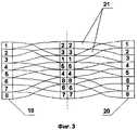 Оптический кодер 18 и оптический декодер 20 выполнены в виде волоконно-оптических световодов (фиг.3) с зафиксированным расположением оптических волокон 21 на их входах, не идентичным зафиксированному их расположению на выходах. Расположение оптических волокон 21 на входе оптического кодера 18 идентично их расположению на выходе оптического декодера 20, а расположение оптических волокон 21 на выходе оптического кодера 18 идентично их расположению на входе оптического декодера 20.The