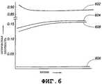 Измерение цветового поглощения в цветовых каналах обеспечивает прогнозирование цветового поглощения на других длинах волн или в других каналах. Пример конкретного варианта применения алгоритма цветовой коррекции к данным, показанным на фиг.4, проиллюстрирован на фиг.6. Оптическая плотность в канале метана (отображенном на кривой 604) и оптическая плотность в базовом канале (отображенном на кривой 606) значительно снижены, потому что устранены влияния цветового поглощения. Оптическая плотность в канале нефти (отображенном на кривой 602) тоже значительно снижена в результате применения алгоритма цветовой коррекции. Как можно увидеть на фиг.6, кривая 604 канала метана после цветовой коррекции возрастает до асимптотического значения. Кривая 606 базового канала после цветовой коррекции находится почти на нулевом уровне, показывая, что наибольшая доля оптической плотности, характеризуемой кривой (406 на фиг.4) базового канала, была обусловлена цветовым поглощением. Подобно кривой 604 канала метана после цветовой коррекции, кривая 608 метановой разности после цветовой коррекции проявляет нарастание, которое можно использовать для прогнозирования загрязнения, так что каналы метана, нефти и базовый канал после цветовой коррекции можно использовать для прогнозирования газового фактора.Measurement of color absorption in color channels provides prediction of color absorption at other wavelengths or in other channels. An example of a specific application of the color correction algorithm to the data shown in FIG. 4 is illustrated in FIG. 6. The optical density in the methane channel (displayed on curve 604) and the optical density in the base channel (displayed on curve 606) are significantly reduced because the effects of color absorption are eliminated. The optical density in the oil channel (shown on curve 602) is also significantly reduced as a result of applying the color correction algorithm. As can be seen in FIG. 6, the