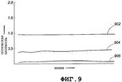 На фиг.9 показаны кривые для канала нефти (отображенного на кривой 902), канала метана (отображенного на кривой 904) и базового канала (отображенного на кривой 906); эти кривые аналогичны кривым согласно фиг.8, но получены после устранения влияния воды путем вычитания параметров поглощений в воде из соответствующих параметров каждого канала. Кривые 902, 904 и 906 имеют значительно меньшую флуктуацию, чем та, которая была перед реализацией алгоритма коррекции по содержанию воды. Это повышает точность прогнозов загрязнения и газового фактора.Figure 9 shows the curves for the oil channel (displayed on curve 902), the methane channel (displayed on curve 904) and the base channel (displayed on curve 906); these curves are similar to those of Fig. 8, but obtained after eliminating the influence of water by subtracting the absorption parameters in water from the corresponding parameters of each channel.