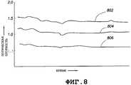 На фиг.8 показаны кривые для канала нефти (отображенного на кривой 802), канала метана (отображенного на кривой 804) и базового канала (отображенного на кривой 806), полученные при анализе жидкой пробы, взятой из скважины, пробуренной с применением бурового раствора на водной основе. Кривые на фиг.8 получены после истечения некоторого периода времени, так что начальное нарастание не заметно, а линии являются относительно пологими. Тем не менее, на фиг.8 можно заметить, что изменяющееся содержание воды в пробе текучей среды обуславливает флуктуации оптической плотности, измеряемой в каналах.On Fig shows the curves for the oil channel (displayed on curve 802), methane channel (displayed on curve 804) and the base channel (displayed on curve 806) obtained in the analysis of a fluid sample taken from a well drilled using drilling mud on water based. The curves in Fig. 8 are obtained after a certain period of time, so that the initial rise is not noticeable, and the lines are relatively gentle. However, in FIG. 8, it can be seen that the varying water content in the fluid sample causes fluctuations in the optical density measured in the channels.