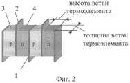Прототипом изобретения является ТЭБ, описанная в [1]. ТЭБ состоит из последовательно соединенных в электрическую цепь полупроводниковых термоэлементов, каждый из которых образован двумя ветвями (столбиками, выполненными либо цилиндрическими, либо в виде прямоугольного параллелепипеда), изготовленными из полупроводника соответственно р- и n-типа. Ветви термоэлементов соединяются между собой посредством коммутационных пластин, причем ветви р-типа и n-типа контактируют торцевыми поверхностями соответственно с двумя противоположными поверхностями коммутационной пластины. Коммутационные пластины имеют несколько большую площадь, чем площадь поперечного сечения ветвей, вследствие чего они выступают за поверхность структуры, образованной ветвями ТЭБ, причем нечетные коммутационные пластины выступают за одну поверхность структуры, а четные коммутационные пластины - за другую. Соответственно отвод и подвод теплоты осуществляется с выступающих частей коммутационных пластин за счет воздушного или жидкостного теплообмена.The prototype of the invention is the thermopile, described in [1]. A fuel cell consists of semiconductor thermoelements connected in series to an electric circuit, each of which is formed by two branches (columns made either cylindrical or in the form of a rectangular parallelepiped) made of a p- and n-type semiconductor, respectively. The branches of the thermocouples are interconnected by means of patch plates, the p-type and n-type branches contacting the end surfaces with two opposite surfaces of the connecting plate, respectively. The patch plates have a slightly larger area than the cross-sectional area of the branches, as a result of which they protrude beyond the surface of the structure formed by the thermopile branches, with the odd patch plates protruding over one surface of the structure, and the even patch plates over the other. Accordingly, heat is removed and supplied from the protruding parts of the switching plates due to air or liquid heat exchange.