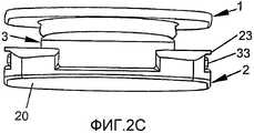 Протез межпозвоночного диска согласно некоторым вариантам осуществления позволяет, например, исправлять дефекты лордоза. Наличие угла между верхней пластинкой (1) и нижней пластинкой (2) протеза может быть желательным. Такой угол может быть получен при изготовлении верхней пластинки, срединные плоскости которой, представляющие ее нижнюю и верхнюю поверхности, образуют угол. Другая возможность включает в себя нижнюю пластинку, срединные плоскости которой, представляющие ее нижнюю и верхнюю поверхности, образуют угол, как иллюстрируется на фиг.2C и 2D, в которой нижняя поверхность (20) нижней пластинки (2) образует угол с ее верхней поверхностью. Другая возможность получения такого угла обеспечивается только протезами такого же типа, как в предпочтительных вариантах осуществления изобретения, и состоит в слегка смещенном положении ядра относительно центра протеза. Это слегка смещенное положение ядра может, например, поддерживаться благодаря регулируемому расположению охватываемого и охватывающего средств взаимодействия между собой. Если хирург желает, например, чтобы протез вызывал лордоз, который остается в пределах некоторого диапазона значений, он выберет протез, ядро (3) которого может иметь незначительный люфт при сдвиге и при вращении относительно нижней пластинки (2), но вокруг положения, устанавливающего незначительный перманентный наклон по меньшей мере для одной из пластинок, благодаря точному регулированию средств взаимодействия между ядром и нижней пластинкой (2). Это средство (23) взаимодействия, которое симметрично расположено относительно центра нижней пластинки (2) на фиг.3A и 3C, может быть, таким образом, смещено по меньшей мере в одном направлении, чтобы установить этот незначительный перманентный наклон по меньшей мере для одной из пластинок.An intervertebral disc prosthesis according to some embodiments allows, for example, the correction of defects of lordosis. The presence of an angle between the upper plate (1) and the lower plate (2) of the prosthesis may be desirable. Such an angle can be obtained in the manufacture of the upper plate, the median planes of which, representing its lower and upper surfaces, form an angle. Another possibility includes a lower plate, the median planes of which, representing its lower and upper surfaces, form an angle, as illustrated in FIGS. 2C and 2D, in which the lower surface (20) of the lower plate (2) forms an angle with its upper surface. Another possibility of obtaining such an angle is provided only by prostheses of the same type as in the preferred embodiments of the invention, and consists in a slightly offset position of the core relative to the center of the prosthesis. This slightly shifted position of the core can, for example, be maintained by the adjustable arrangement of the male and female means of interaction with each other. If the surgeon wants, for example, that the prosthesis causes lordosis that remains within a certain range of values, he will choose a prosthesis whose core (3) may have slight backlash when shifting and rotating relative to the lower plate (2), but around a position that sets a slight permanent tilt for at least one of the plates, due to the precise regulation of the means of interaction between the core and the lower plate (2). This interaction means (23), which is symmetrically located relative to the center of the lower plate (2) in FIGS. 3A and 3C, can thus be offset in at least one direction to establish this slight permanent tilt for at least one of records.