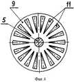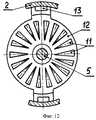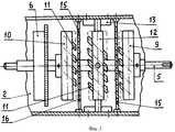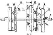 Электродвигатель постоянного тока 1 может работать в нескольких режимах. При подключении к сети электродвигателя ручка переключения 14 находится в среднем положении (фиг.1), неподвижный диск 12 с магнитами 11 также находится в среднем положении. Вал электродвигателя вращается и через шестерни 7, 8, зубчатый венец маховика 6 вращает ведомый вал 5. При этом маховик 6 за счет инерции запасает энергию вращения и делает его равномерным. В этом случае никакого усиления крутящего момента не происходит. Если электродвигатель подключен к сети таким образом, что ведомый вал 5 вращается по часовой стрелке и необходимо увеличить крутящий момент, то ручка управления 14 поворачивается вправо. Неподвижный диск 12 с магнитами 11 механизмом, не показанным на чертеже, передвигается вдоль по направляющим 13 в сторону переднего подвижного диска 9 (на фигуре 15 показано горизонтальной стрелкой) и фиксируется на некотором расстоянии от неподвижного защитного диска 15. В этом случае к силе F, с которой вращается передний подвижный диск 9, добавляется сила Fм, которая возникает при отталкивании магнитов 11 переднего подвижного диска 9 от одноименных полюсов магнитов 11 неподвижного диска 12. Это происходит, когда магниты неподвижного диска 12 и магниты переднего подвижного диска 9, а также пазы 16 неподвижного защитного диска 15 находятся на одной линии, как показано на фигуре 15. Сила отталкивания Fм и сила F, с которой вращается передний подвижный диск 9, действующие под углом друг к другу, образуют равнодействующую силу Fр, которая является результирующей силой, действующей на передний подвижный диск 9, и которая больше силы F. Следовательно, происходит увеличение крутящего момента на переднем подвижном диске 9 и соответственно на ведомом валу 5. В то время, когда магнитное поле магнитов переднего подвижного диска 9 и неподвижного диска 12 направлено вдоль ведомого вала и может тормозить ведомый вал, неподвижный защитный диск 15 не дает возможности взаимодействовать магнитам обоих дисков, экранируя их. Маховик 6 помогает выводить диски из этого положения. Таким образом при вращении переднего подвижного диска 9 из-за одновременного периодического отталкивания его магнитов от магнитов неподвижного диска 12 происходит увеличение крутящего момента. При переключении электродвигателя 1 на обратный ход ведомый вал 5 начинает вращаться в противоположную сторону против часовой стрелки. Ручка переключателя 14 передвигается влево и фиксируется (На фигуре 16 показано горизонтальной стрелкой). Неподвижный диск 12 передвигается в сторону заднего подвижного диска 10 и магниты обоих дисков начинают взаимодействовать друг с другом, как было описано выше. При этом также происходит увеличение крутящего момента. Таким образом за счет энергии постоянных магнитов можно получить более высокую мощность на ведомом валу при меньшей затратной мощности на ведущем валу.The