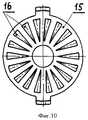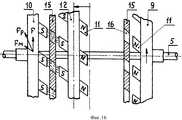 Сущность изобретения поясняется чертежами, где на фигуре 1 изображен общий вид электродвигателя постоянного тока с редуктором, на фигуре 2 - схема размещения узлов в корпусе редуктора, на фигуре 3 - устройство усилителя крутящего момента, на фигуре 4 - вид на заднюю торцевую поверхность переднего подвижного диска, на фигуре 5 - вид на переднюю торцевую поверхность переднего подвижного диска, на фигуре 6 - вид на боковую поверхность переднего подвижного диска, на фигуре 7 - вид на заднюю торцевую поверхность заднего подвижного диска, на фигуре 8 - вид сбоку на задний подвижный диск, на фигуре 9 - вид на переднюю торцевую поверхность заднего подвижного диска, на фигуре 10 - вид на торцевую поверхность защитного диска, на фигуре 11 - вид сбоку на защитный диск, на фигуре 12 - вид на торцевую поверхность неподвижного диска, на фигуре 13 - вид сбоку на неподвижный диск с частичным разрезом, на фигуре 14 - общий вид магнита подвижных и неподвижного дисков, на фигуре 15 - схема усиления крутящего момента при прямом вращении ведомого вала, на фигуре 16 - схема усиления крутящего момента при обратном вращении ведомого вала.The invention is illustrated by drawings, where figure 1 shows a General view of a DC motor with gear, figure 2 is a diagram of the nodes in the gear housing, figure 3 is a torque amplifier device, figure 4 is a view of the rear end surface of the front movable disk , in figure 5 is a view of the front end surface of the front movable disk, in figure 6 is a view of the side surface of the front movable disk, in figure 7 is a view of the rear end surface of the rear movable disk, in figure 8 - id on the side of the rear movable disk, in figure 9 - view of the front end surface of the rear movable disk, in figure 10 - view of the end surface of the protective disk, in figure 11 - side view of the protective disk, in figure 12 - view of the end surface of the stationary disk, in figure 13 is a side view of a stationary disk with a partial section, in figure 14 is a General view of the magnet of the movable and fixed disks, in figure 15 is a diagram of the torque amplification with direct rotation of the driven shaft, in figure 16 is a diagram of the torque amplification for reverse rotated and the driven shaft.