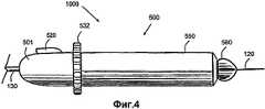 На фиг.2 представлен вид сбоку вводимой in vivo рабочей секции 100 бурава, как примерного варианта осуществления участка бурава 1000 для прохождения закупорок, в соответствии с фиг.1. Рабочая секция 100 бурава содержит стержень 130, например, такой, как в существующей системе сосудистого катетера для лечения закупоренных кровеносных сосудов. Стержень 130 заканчивается дистально, например, дугой 110, которая является гибкой и упругой и содержит дистальный конец, заканчивающийся опорной полкой 112, где находится свободное отверстие 113 опорной полки. Проволочный направитель 120, или проволока 120, расположена соосно со стержнем 130, вдоль и внутри него, и с прохождением через отверстие 113 в опорной полке, которое выполнено с возможностью регулируемого двунаправленного перемещения и поворота проволоки 120. Проволока 120 содержит гибкий и упругий свободный дистальный концевой участок 121, оканчивающийся узлом 122 приложения усилия, показанным в виде сферической головки 122В и приспособленным для регулируемого и обратимого дистального выдвижения от опорной полки 112. В примерном варианте осуществления как узел 122 приложения усилия, так и дуга 110 содержат материал, не прозрачный для рентгеновского излучения, чтобы оператор ОР, наблюдающий за процедурой с использованием системы визуализации, например, компьютерного томографа (СТ) или радиографа, мог наглядно представлять расположение узла 122 приложения усилия относительно опорной полки 112.FIG. 2 is a side view of an in vivo injected