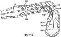 В процессе работы проволоку 120 сначала направляют в дистальном направлении через кровеносные сосуды 300 внутри стенок 310 сосудов, пока узел 122 приложения усилия не войдет в контакт с закупоркой 320 или складкой 340 в закупорке 320. Тогда стержень 130 и узел 122 приложения усилия соединяются и приводятся в движение для сгибания и аркообразного искривления дуги 110. Тем самым узел 122 приложения усилия и выпуклая поверхность аркообразно изогнутой спинки 117 дуги внедряются в закупоривающую ткань, выкладывающую складку 340, в разъединяемое скрепление, с расположением смежно с противоположными стенками 310 сосуда.In operation, the