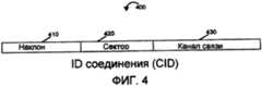 Фиг.4 иллюстрирует примерный идентификатор соединения (CID) 400, осуществленный в соответствии с этим изобретением. CID 400 включает в себя «наклон» 410, который является идентификатором ячейки, «сектор» 420, который является идентификатором сектора, и «несущую» 430, которая является идентификатором несущей частоты, также известным как идентификатор блока тонов.Figure 4 illustrates an example connection identifier (CID) 400 implemented in accordance with this invention.