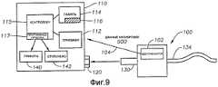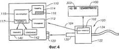 Описанная выше конфигурация РЧИД является «пассивной», так как приемопередатчик питается от энергии, хранимой в конденсаторе, которая генерируется РЧ-сигналом от считывателя. Таким образом нормально что, пассивный идентификатор РЧИД является неактивным и не имеет независимого источника питания. Система РЧИД также может быть активной, если предусмотрен отдельный источник питания или батарея. Дополнительные подробности, касающиеся того, как работают системы РЧИД, хорошо известны в технике и поэтому не описываются более подробно в данном описании изобретения. Для целей объяснения, не ограничения, данное описание изобретения относится к компонентам РЧИД, которые используются для передачи данных между консолью 110 и зондом 100. Однако для специалиста в данной области техники понятно, что также могут использоваться другие компоненты передатчика, приемника и приемопередатчика.The RFID configuration described above is “passive” because the transceiver is powered by the energy stored in the capacitor, which is generated by the RF signal from the reader. Thus, it is normal that the passive RFID is inactive and does not have an independent power source. An RFID system can also be active if a separate power source or battery is provided. Additional details regarding how RFID systems work are well known in the art and therefore are not described in more detail in this description of the invention. For purposes of explanation, not limitation, this description of the invention relates to RFID components that are used to transfer data between the