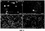 На Фиг.8 представлены фотографии, показывающие, что введение антагонистического антитела против NGF позволяет уменьшить нейрохимические изменения и инфильтрацию макрофага в ганглий задних корешков (DRG) спинного мозга пораженных опухолью животных. На Фиг.8а и 8b показано иммунофлуоресцентное окрашивание фактора активации транскрипции 3 (ATF-3) в ипсилатеральном DRG L2 пораженных опухолью животных, которым вводили носитель (а, n=8) и антитело против NGF (b, n=8), через четырнадцать дней после имплантации опухоли. В нижнем блоке показано иммунофлуоресцентное окрашивание CD-68, характеризующее плотность активированных и инфильтрующихся макрофагов вокруг пораженных сенсорных нейронов в ипсилатеральном DRG пораженных опухолью животных, которым вводили носитель (с, n=7) и антитело против NGF (d, n=7). Масштаб: шкала для а-d = 5 мкм.On Fig presents photographs showing that the introduction of an antagonistic antibody against NGF can reduce neurochemical changes and macrophage infiltration in the ganglion of the posterior roots (DRG) of the spinal cord of tumor-affected animals. Figures 8a and 8b show immunofluorescence staining of transcription activation factor 3 (ATF-3) in ipsilateral DRG L2 of tumor-affected animals that were treated with vehicle (a, n = 8) and anti-NGF antibody (b, n = 8) after fourteen days after tumor implantation. The lower block shows the immunofluorescence staining of CD-68, which characterizes the density of activated and infiltrating macrophages around the affected sensory neurons in the ipsilateral DRG of tumor-affected animals that were injected with vehicle (c, n = 7) and anti-NGF antibody (d, n = 7). Scale: scale for a-d = 5 microns.