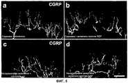 На Фиг.5 представлены фотографии, показывающие, что лечение антителом против NGF не оказывает заметного воздействия на иннервацию сенсорных нейронов в коже. Образцы кожи задней лапы мышей, которым инъецировали саркому, (а, b) и незараженных мышей (с, d) подвергали иммунному окрашиванию пептидом, родственным гену кальцитонина нейропептида (CGRP), который метит немиелинизированные пептидергические сенсорные нервные волокна. На данной фигуре показано иммунное окрашивание CGRP образцов кожи задней лапы мышей (а, n=3), которым инъецировали саркому и носитель, мышей (b, n=8), которым инъецировали саркому и антитело против NGF, незараженных мышей, которым вводили носитель, (с, n=8) и незараженных мышей (d, n=8), которым вводили антитело против NGF. Масштаб: шкала 50 мкм.Figure 5 presents photographs showing that treatment with an anti-NGF antibody does not significantly affect the innervation of sensory neurons in the skin. Skin samples of the hind paw of mice injected with sarcoma (a, b) and non-infected mice (c, d) were immunostained with a peptide related to the neuropeptide calcitonin gene (CGRP), which marks non-myelinated peptidergic sensory nerve fibers. This figure shows the immune staining of CGRP skin samples of the hind paw of mice (a, n = 3) injected with sarcoma and vehicle, mice (b, n = 8) who injected sarcoma and anti-NGF antibody, non-infected mice that were vehicle (c, n = 8) and uninfected mice (d, n = 8) to which an anti-NGF antibody was administered. Scale: 50 micron scale.