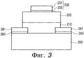 На упомянутой подложке методом электронно-лучевого напыления сформировали пленку 283 Ti (толщина пленки: 5 нм) и пленку 281 Au (толщина пленки: 40 нм) в указанном порядке, а затем подвергли их формированию рисунка (структурированию) с получением рисунка, показанного на фиг.3. В результате были сформированы электрод истока и электрод стока. После этого на части обоих этих электродов сформировали резист (не показан), который подвергли формированию рисунка, и нанесли слой 210 аморфного оксида методом высокочастотного ионного распыления. После этого в качестве изолирующего затвор слоя сформировали пленку 220 Y2O3 (толщина пленки: 140 нм) методом высокочастотного ионного распыления, как упомянуто выше.A 283 Ti film (film thickness: 5 nm) and a 281 Au film (film thickness: 40 nm) were formed on the said substrate by electron beam sputtering in this order, and then they were patterned (patterned) to obtain the pattern shown in FIG. .3. As a result, a source electrode and a drain electrode were formed. Thereafter, a resist (not shown) was formed on parts of both of these electrodes, which were patterned, and an