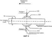 На фиг.3 показан другой вариант 120 настоящей индукционной плазменной горелки, имеющей одну или более смещенных от центра форсунок введения химических реагентов, переднюю форсунку 122 введения химических реагентов и заднюю форсунку 124 введения химических реагентов. Обычно плазменные горелки известного уровня техники включают окна введения химических реагентов, которые расположены прямо противоположно друг другу. В данном варианте задняя форсунка 124 введения химических реагентов находится на одной линии с центральной линией индукционной плазменной горелки 120, а передняя форсунка 122 введения химических реагентов движется вперед в том же направлении, что и вращающаяся мишень 30, примерно на 8 мм вперед от задней форсунки 124 введения химических реагентов. С указанным расположением и при работе в «направлении вперед», как показано на фиг.3, достигаются увеличение скорости напыления и лучшее регулирование диаметра мишени. Это обеспечивает более равномерный диаметр вращающейся мишени 30.FIG. 3 shows another