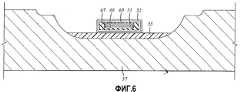 Фиг.4 иллюстрирует датчик бокового удельного сопротивления (тороидальную антенну), смонтированную в углублении трубы согласно варианту осуществления изобретения. Фиг.5 показывает участок продольного сечения тороидального датчика. Как показано на фиг.4 и 5, труба 57 включает углубление 53. Основа углубления 53 вырезается на некоторую требуемую глубину. Боковой датчик, состоящий из тороидальной антенны 50, которая состоит из магнитного сердечника 51 и проводящего провода 52, смонтирована в углублении 53.4 illustrates a lateral resistivity sensor (toroidal antenna) mounted in a recess of a pipe according to an embodiment of the invention. Figure 5 shows a section of a longitudinal section of a toroidal sensor. As shown in FIGS. 4 and 5, the
