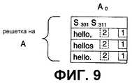 Решетки по фиг.5 были созданы, основываясь на узлах уровня строки по фиг.4. Решетки могут формироваться на любых уровнях по фиг.4. На фиг.8 показана решетка, соответствующая узлу Н абзаца. Здесь, девять столбцов показаны в итоге. Столбцы решетки представляют узлы слова по фиг.4 и их альтернативы. Решетка по фиг.9 изображает решетку, соответствующую узлу А слова.The lattices of FIG. 5 were created based on the line level nodes of FIG. 4. Lattices can be formed at any levels in figure 4. On Fig shows the lattice corresponding to the node H of the paragraph. Here, nine columns are shown as a result. The lattice columns represent the word nodes of FIG. 4 and their alternatives. The lattice of Fig. 9 depicts a lattice corresponding to the node A of the word.