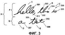 На фиг.3 изображены электронные чернила, которые синтаксически разобраны и представлены в виде дерева на фиг.4. Электронными чернилами на фиг.3 является фраза “hello, this is a test”, при этом пять слов из фразы представлены метками А-Е. Слово “hello,” А включает в себя два штриха 301 и 311. Слово “this” В включает в себя три штриха 302-304. Слово “is” С включает в себя два штриха 305-306. Слово “a” D включает в себя один штрих 307. Слово “test” Е включает в себя штрихи 308-309. Фраза занимает две строки F (“hello, this is”) и G (“a test”). Эти строки вместе образуют абзац Н.Figure 3 shows electronic ink, which is syntactically parsed and presented in the form of a tree in figure 4. The electronic ink in FIG. 3 is the phrase “hello, this is a test”, with five words from the phrase represented by labels AE. The word “hello,” A includes two