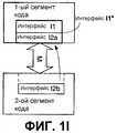 Передача от одного сегмента кода к другому может осуществляться косвенно разбиением передачи на множество дискретных передач. Это схематически описывается на фиг.1D и 1Е. Как показано, некоторые интерфейсы могут описываться на языке делимых наборов функциональных возможностей. Таким образом, функциональные возможности интерфейса по фиг.1В и 1С могут быть разложены на элементарные операции для достижения такого же результата, точно так же, как можно математически получить 24, 2 умножив на 2, умножив на 3, умножив на 2. Следовательно, как изображено на фиг.1D, функция, представляемая интерфейсом Interface1, может быть разделена для преобразования передачи интерфейса на множества интерфейсов Interface1A, Interface1B, Interface1C и т. д., в то же время достигая такого же результата. Как изображено на фиг.1Е, функция, представляемая интерфейсом I1, может быть разделена на множество интерфейсов I1a, I1b, I1c и т. д., в то же время достигая такого же результата. Аналогично, интерфейс I2 второго сегмента кода, который принимает информацию от первого сегмента кода, может быть разложен на множество интерфейсов I2a, I2b, I2c и т. д. При разложении на элементарные операции количество интерфейсов, включенных в 1-й сегмент кода, необязательно совпадает с количеством интерфейсов, включенных во 2-й сегмент кода. В обоих случаях по фиг.1D и 1Е, функциональная сущность интерфейсов Interface1 и I1 остается такой же, что и на фиг.1В и 1С соответственно. Разложение на элементарные операции интерфейсов также может подчиняться ассоциативным, коммутативным и другим математическим свойствам, так что разложение на элементарные операции может быть трудным для распознавания. Например, порядок операций может не иметь значения, и, следовательно, функция, выполняемая интерфейсом, может выполняться задолго до достижения интерфейса, другой частью кода или интерфейса или выполняться отдельным компонентом системы. Кроме того, для специалиста в области программирования может быть понятно, что существует множество путей выполнения различных вызовов функции, которые достигают одинакового результата.Transmission from one code segment to another can be done indirectly by splitting the transmission into multiple discrete transfers. This is schematically described in FIGS. 1D and 1E. As shown, some interfaces can be described in the language of divisible feature sets. Thus, the functionality of the interface of FIGS. 1B and 1C can be decomposed into elementary operations to achieve the same result, just as you can mathematically get 24, 2