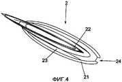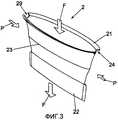 Входной фланец 2 показан более детально на фиг.3 и 4. Входной фланец 2 расположен в центральной части пакета для сбора мочи, как показано на фиг.1. Входной фланец 2 выполнен из упругого пластмассового материала и в основном с плоской конфигурацией, которая открывается при приложении давления к боковым кромкам, как указано стрелками Р. За счет этого две боковые части 23 изгибаются наружу и создают проход, обеспечивающий прохождение потока F через входное отверстие. Самая наружная периферия 23 может быть снабжена вырезом 24 на двух угловых кромках для исключения коробления сторон 23 входного фланца при открывании входного фланца 2 посредством приложения направленного внутрь давления Р к складкам.The
