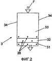 Невозвратная клапанная пленочная система 3 не приваривается к сторонам мешка, как в предшествующем уровне техники, а проходит от входного фланца в отделение для текучей среды мешка. Невозвратный клапан 3, показанный на фиг.2, выполнен из шести гибких пленочных слоев, образующих три пары слоев 31, 32, 33, при этом пленочные слои 31, 32, 33 сварены вдоль своих сторон 34 и имеют точечную сварку 35 на дальнем конце пленочной системы с образованием направленного пути F потока через гибкую пленочную невозвратную клапанную систему 3. В этом варианте выполнения внутренние пленочные слои могут быть предусмотрены с длиной 10 см, при этом пара средних пленочных слоев имеет длину 13 см, а самые наружные слои имеют длину 14 см. Материалом пленки может быть PELD, который является полиэтиленом низкой плотности, который является прозрачным, мягким и очень гибким. Однако понятно, что можно использовать гибкие пленочные материалы других типов, включая как однослойные, так и многослойные материалы. Входной фланец выполнен из относительно жесткого пластмассового материала.The non-return