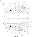 Раструбный элемент дополнительно включает в себя окружную уплотнительную канавку 42, расположенную на внутренней поверхности 26. В уплотнительной канавке размещено эластомерное окружное уплотнение для текучей среды, выполненное в виде уплотнительного кольца 44 и предназначенное для обеспечения герметичного контакта с наружной поверхностью 24 охватываемого элемента для создания уплотнения для текучей среды между охватываемым элементом и раструбным элементом в конфигурации при блокировке. Дополнительное уплотнение обеспечивается наружной поверхностью охватываемого элемента и соответствующей внутренней поверхностью раструбного элемента, имеющими комплементарные профили, приспособленные для соединения по точной посадке в конфигурации при блокировке. Данные профили также включают в себя соответствующие конические участки 45 для облегчения исходного выравнивания и введения в контакт.The bell-shaped element further includes a