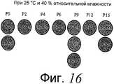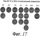 На фиг. 16 показаны цвета восстановленной формы образцов индикатора кислорода настоящего изобретения, хранившихся при 25°C и 48% относительной влажности и классифицированных по Pantone-эталонам.In FIG. 16 shows the reconstituted colors of the oxygen indicator samples of the present invention stored at 25 ° C. and 48% relative humidity and classified by Pantone standards.