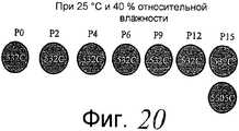 На фиг. 20 показаны цвета окисленной формы образцов индикатора кислорода настоящего изобретения, хранившихся при 25°C и 48% относительной влажности и классифицированных по Pantone-эталонам.In FIG. 20 shows the colors of the oxidized form of the oxygen indicator samples of the present invention, stored at 25 ° C. and 48% relative humidity and classified by Pantone standards.