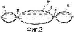 Предпочтительно, хрупкие барьеры или открывающиеся швы 22 и 24 используются для разделения камер. На фиг. 2 показано поперечное сечение контейнера 10 и показано, как открывающиеся швы 22, 24 разделяют рецептуры, содержащиеся в камерах 12, 14, 16. Открывающиеся швы могут быть в форме отслаивающегося шва или хрупких швов. Открывающиеся швы позволяют рецептурам храниться раздельно и смешиваться только перед применением, делая возможным в результате хранение в одном контейнере рецептур, которые не должны храниться как смесь в течение длительного периода времени. Открытие швов обеспечивает сообщение между камерами и смешивание содержимого соответствующих камер. Хотя контейнеры, имеющие хрупкие швы, являются известными, очень трудно, если не невозможно, выборочно открыть один или меньше, чем все швы с использованием типичного способа прокатывания многокамерного мешка. Желательным является выборочное открытие швов, потому что имеются случаи, когда одна из рецептур трехрецептурного контейнера не должна быть применена. Выборочное открытие швов будет рассмотрено более подробно ниже.Preferably, fragile barriers or opening