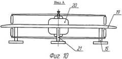 На фиг.10 - вид по стрелке А на фиг.9, где показано расположение фюзеляжа 20, несущей плоскости 19, передней 21 и боковых опор 15.Figure 10 is a view along arrow A in figure 9, which shows the location of the