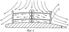 На фиг.4 показана схема способа обеспечения вертикального взлета и посадки с расположением двух роторных движителей над несущей плоскостью. Продольный разрез. Этот вариант способа обеспечивает создание зоны разряжения только над несущей плоскостью с помощью расположенных там двух вращающихся в противоположные стороны роторов с лопастями 8 и 9. В результате этого разряжения возникает перепад давления на несущую плоскость и подъемная сила.Figure 4 shows a diagram of a method for providing vertical take-off and landing with the location of two rotary propulsors above the bearing plane. Lengthwise cut. This variant of the method provides the creation of a rarefaction zone only above the carrier plane with the help of two rotors rotating in opposite directions with