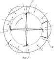 Фиг.2. Схема способа обеспечения вертикального взлета и посадки с расположением роторных движителей над несущей плоскостью и под ней. Вид сверху.Figure 2. A diagram of a method for providing vertical take-off and landing with the location of rotary propulsors above and below the bearing plane. View from above.