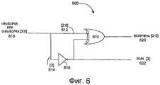 На фиг.6 проиллюстрирован вариант осуществления преобразования "знак, величина", например, которое может быть реализовано в трехуровневых преобразователях 914 (фиг.9) с использованием четырехбитовых выборок 610, выполненных АЦП. Четырехбитовые выборки 610, выполненные АЦП, преобразовывают в формат "знак-величина" с 1-битовым знаком 622 и трехбитовой величиной 620 с использованием инвертора 618 и логического элемента 616 "исключающее ИЛИ", которые совершают операции соответственно с тремя младшими значащими битами 612 и со старшим значащим битом 614. Выборки 610, выполненные АЦП, принимают значения в интервале от 0 до 15, при этом нулевая точка находится посередине между значениями 7 и 8 (предполагая, что нулевая точка отрегулирована надлежащим образом). Выборки 610 0 и 15, выполненные АЦП, являются наибольшими по величине. Знак 622 значения "знак-величина" представляет собой величину, обратную величине старшего значащего бита 614 из соответствующей выборки, выполненной АЦП. Для положительных значений знака величина 620 равна младшим значащим битам 612 АЦП. Для отрицательных значений знака величина 620 равна поразрядно величине, обратной младшим значащим битам 612 АЦП.Figure 6 illustrates an embodiment of the conversion of the sign, value, for example, which can be implemented in three-level converters 914 (Fig.9) using four-bit samples 610 performed by the ADC. The four-bit samples 610 performed by the ADC are converted to a sign-to-size format with a 1-