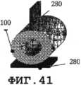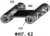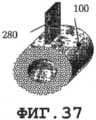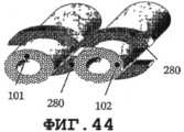 Фиг.42 поясняет предлагаемое применение одного пьезорезонатора 280 для возбуждения SAW на разных частях медицинского устройства 101 и 102. Фиг.36-38 поясняют предлагаемые варианты присоединения одной и той же пьезопластины 280 к медицинскому устройству 100. Ориентацию пластины относительно медицинского устройства следует выбирать с учетом требуемого SAW-процесса и конструктивных (геометрических) особенностей медицинского устройства. На фиг.39 показано присоединение оболочечной пьезопластины 280. На фиг.40 показана предлагаемая тонкая пьезопластина 280 в форме сегмента кольца. Варианты применения с использованием, по меньшей мере, двух пьезопластин 280 схематично показаны на фиг.41 и 43. На фиг.44 показано предлагаемое изобретение в варианте, когда элемент 280 фиксации медицинского устройства состоит из оболочечных пьезоэлементов 280.Fig. 42 illustrates the proposed use of a