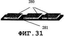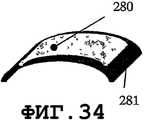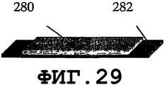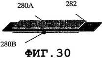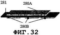 На фиг.29-33 показано применение биморфных пьезоэлементов. На фиг.29 показана простая биморфная пластина, состоящая из одной тонкой пьезопластины 280, прикрепленной к металлической подложке 282. На фиг.30 показаны два пьезоэлемента 280А и 280В, прикрепленные к одной опорной пластине 282. На фиг.31 показаны, по меньшей мере, два пьезоэлемента 280, механически прикрепленных к одной опорной пластине. На фиг.32 и 33 показаны другие предлагаемые варианты крепления пьезоэлементов 280 к металлической опорной пластине 282. На фиг.34 показано применение биморфного пьезоэлемента типа тонкой оболочки. Расположение пьезоэлементов 280 относительно пластины 282 может включать в себя все возможные вышеописанные варианты.In Fig.29-33 shows the use of bimorph piezoelectric elements. Fig. 29 shows a simple bimorph plate consisting of one thin