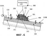 На фиг.6 показана возможность образования SAW (процесса создания виртуального нановибрационного покрытия) на всей внешней поверхности устройства 110. Относительно резонатора SAW-процесс мощнее в положительном направлении 113А, чем в противоположном направлении 113 В. Этого можно добиться с системой 400 связи призматической формы. Два тонких резонатора 250 и 260 на пьезоэлементах присоединяют к системе связи. Резонатор 250 совершает колебания моды 251 по толщине и генерирует энергию механических колебаний, которая, в виде продольной волны 252, через систему 400 связи переносит механическую энергию в зону между системой связи и поверхностью медицинского устройства. Данная энергия создает SAW в отрицательном направлении 113В относительно резонатора. Условия создания SAW описаны выше со ссылкой на фиг.5. Аналогично, в зоне между системой связи и поверхностью 110 медицинского устройства механическая энергия в форме продольной волны может генерироваться через посредство системы 400 связи модой 261 колебаний по толщине тонкого пьезоэлемента 260. CPU 300 управляет параметрами (частотой, амплитудой, формой сигнала, коэффициентом заполнения и т.п.) тонких пьезоэлементов 250 и 260. Данные пьезоэлементы вибрируют на колебательной моде, соответственно по толщине 251 и по толщине 261. Фиг.5 и 6 поясняют способ возбуждения SAW (процесса создания нановибрационного покрытия) на внешней поверхности медицинского устройства. Аналогично, SAW можно возбуждать на внутренней поверхности медицинского устройства тонким резонатором, присоединенным к внутренним поверхностям 120 устройства. Соответствующие SAW следует выбирать с учетом биологической проблемы. Обычно более высокий уровень SAW требуется для внутренних поверхностей устройства, и более низкие уровни требуются для внешних поверхностей медицинского устройства постоянной установки, в соответствии с требованиями FDA (Управления по контролю за продуктами и лекарствами США) к акустической энергии. Кратковременные высокие уровни SAW могут быть желательными в качестве профилактического средства для предотвращения биопленки на имплантатах и тем самым обеспечения антимикробного и антитромбогенного действия.Figure 6 shows the possibility of the formation of SAW (the process of creating a virtual nanovibrational coating) on the entire outer surface of the
