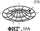На фиг.8 изображена круглая тонкая пьезоэлектрическая мембрана 270, совершающая колебания изгибной (собственной) моды. Мембрана 270 характеризуется следующими параметрами собственной моды колебаний: n=0 и m=1. Данная мембрана может совершать симметричные механические колебания относительно ее оси вращения. SAW на внешней поверхности 110 должна распространяться в направлениях 114А, 114В, 114С, 114D и 115А, 115В, 115С 115D. Аналогично, SAW может распространяться по внутренней поверхности 120 в направлениях 121А, 122А, 121В, 122В (другие направления не показаны). На фиг.9 графически показана возможность изменения направления и уровня распространяющейся SAW посредством управления параметрами колебательных мод тонкой круглой пьезоэлектрической мембраны 270. На фиг.9А, 10А, 11А и 12А графически представлены моды нормальных колебаний мембран круглой формы для разных средних значений n и m.Figure 8 shows a circular thin