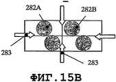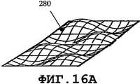 На фиг.14В показана мембрана 280 и возбуждаемая мода механических колебаний тонкой пьезопластины в направлении длины с одним соответствующим периодом. На фиг.15В изображен случай, когда возбуждаемая мода механических колебаний тонкой пьезопластины содержит по одному периоду в направлении длины и в направлении ширины. На фиг.16В изображен случай, когда мода механических колебаний тонкой пьезопластины, при возбуждении, содержит один период в направлении длины и два периода в направлении ширины. Устойчивость возбужденного SAW-процесса в медицинском устройстве соответствует числу периодов колебательных мод, возбужденных в пьезопластине (большее число периодов означает более устойчивый SAW-процесс). Круговая и прямоугольная формы являются не единственными формами, подходящими для предотвращения биопленки посредством возбуждения резонаторов SAW. Такие же колебательные моды можно возбуждать резонаторами с другой геометрией.On figv shows the