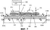 На фиг.7 показан способ, в котором резонатор 270 присоединяют на внешней, или внутренней, или торцевой поверхности медицинского устройства для проведения управляемых SAW-процессов на данных поверхностях. С этой целью тонкий пьезорезонатор 270 возбуждают для колебания одновременно на трех колебательных модах: по толщине 271, продольной 272 и изгибной 273. Минимальную частоту изгибной моды 273 следует выбирать так, чтобы расстояние между двумя фрикционными точками (две точки между максимальными амплитудами) было не меньше, чем длина волны SAW на поверхности; смотри фиг.8. Частоту электрических сигналов, подаваемых в тонкую пьезопластину, подбирают по отношению к частоте 271 моды колебаний по толщине. Данный электрический сигнал в CPU 300 модулируется одновременно еще двумя частотами, соответственно для продольной 272 и изгибной 273 мод. Тонкая пьезопластина 270 посредством системы 400 связи плотно присоединена к внешней поверхности 110 медицинского устройства 100. Тем самым колебания SAW на внешней 110 и внутренней 120 поверхностях возбуждаются одновременно тремя модами механических колебаний. Бегущие волны на внешней поверхности распространяются в положительном 114А и отрицательном 114В направлениях.7 shows a method in which a