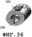 Фиг.35 поясняет предлагаемое применение с раздельными пьезоэлементами на одном резонаторе. Способ допускает возбуждение дополнительной колебательной моды, точнее, изгибной моды по оси симметрии в продольном направлении пьезопластины, показанной на фиг.35. Резонатор SAW может одновременно возбуждать четыре типа колебательных мод, которые представляют колебания по осям x, y, z. Графически изображены мода продольных колебаний 272 в плоскости y-z на графике 272А, мода колебаний 271 по толщине на графике 271А, две моды изгибных колебаний 273 в плоскости z-x на графике 273А и другая изгибная мода колебаний 284 в плоскости y-x на графике 284А. Указанное решение можно обеспечить прикреплением четырех пьезоэлементных частей 280А, 280В, 280С и 280D к одной пластине 281. Данные части электрически соединены следующим образом: 280А с 280С и 280В с 280С. Специальный вариант осуществления может представлять собой одну пьезопластину или один пьезоэлектрический диск, как показано на фиг.24, где электроды подсоединяются к отдельным площадкам на пьезоэлементе. Когда CPU 300 подает электрический сигнал в части 280А и 280С, резонатор на тонком пьезоэлементе начинает колебаться с частотой, соответствующей резонансу изгибной моды 284 пластины в плоскости x-y. При подаче одинакового электрического сигнала в части 280В и 280D, резонатор на тонком пьезоэлементе начинает колебаться противоположным образом благодаря фазовому резонансу моды 284 изгибных колебаний. Если желательно усилить моду 273 изгибных колебаний, поляризации частей 280А и 280В должны быть противоположными поляризации частей 280С и 280D. В результате подачи электрического сигнала, модулированного резонансной частотой вышеупомянутых механических колебаний, из CPU 300 в резонатор на медицинском устройстве можно возбуждать SAW, характеризующиеся разными формами и уровнями. Они также допускают управление в требуемом направлении и передачу на внутреннюю поверхность. При возбуждении второй высшей гармоники стоячей волны в тонком пьезоэлементе эффективность процесса создания нановибрационного покрытия повышается приблизительно на 30% по сравнению со стоячей волной первой гармоники.Fig. 35 illustrates the proposed application with separate piezoelectric elements on a single resonator. The method allows the excitation of an additional vibrational mode, more precisely, the bending mode along the axis of symmetry in the longitudinal direction of the piezoelectric plate shown in Fig. 35. The SAW resonator can simultaneously excite four types of vibrational modes, which represent oscillations along the x, y, z axes. The mode of